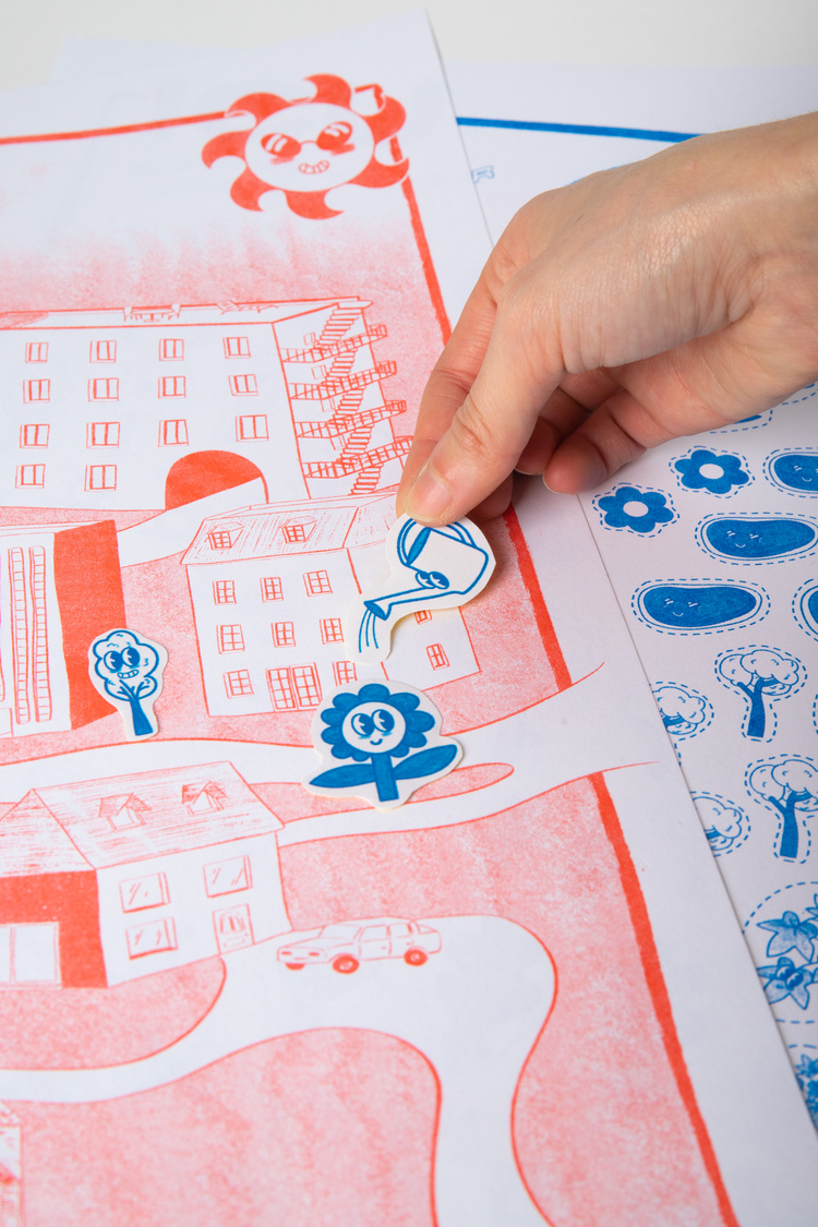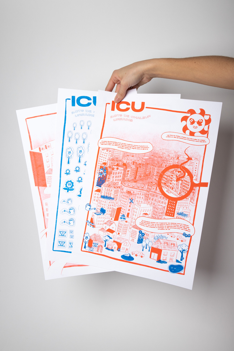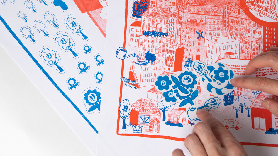 The kit is designed to open a discussion with children about a climate change phenomenon. It includes a main poster explaining the phenomenon, a pattern poster to cut out and stick on a city poster to fill in.