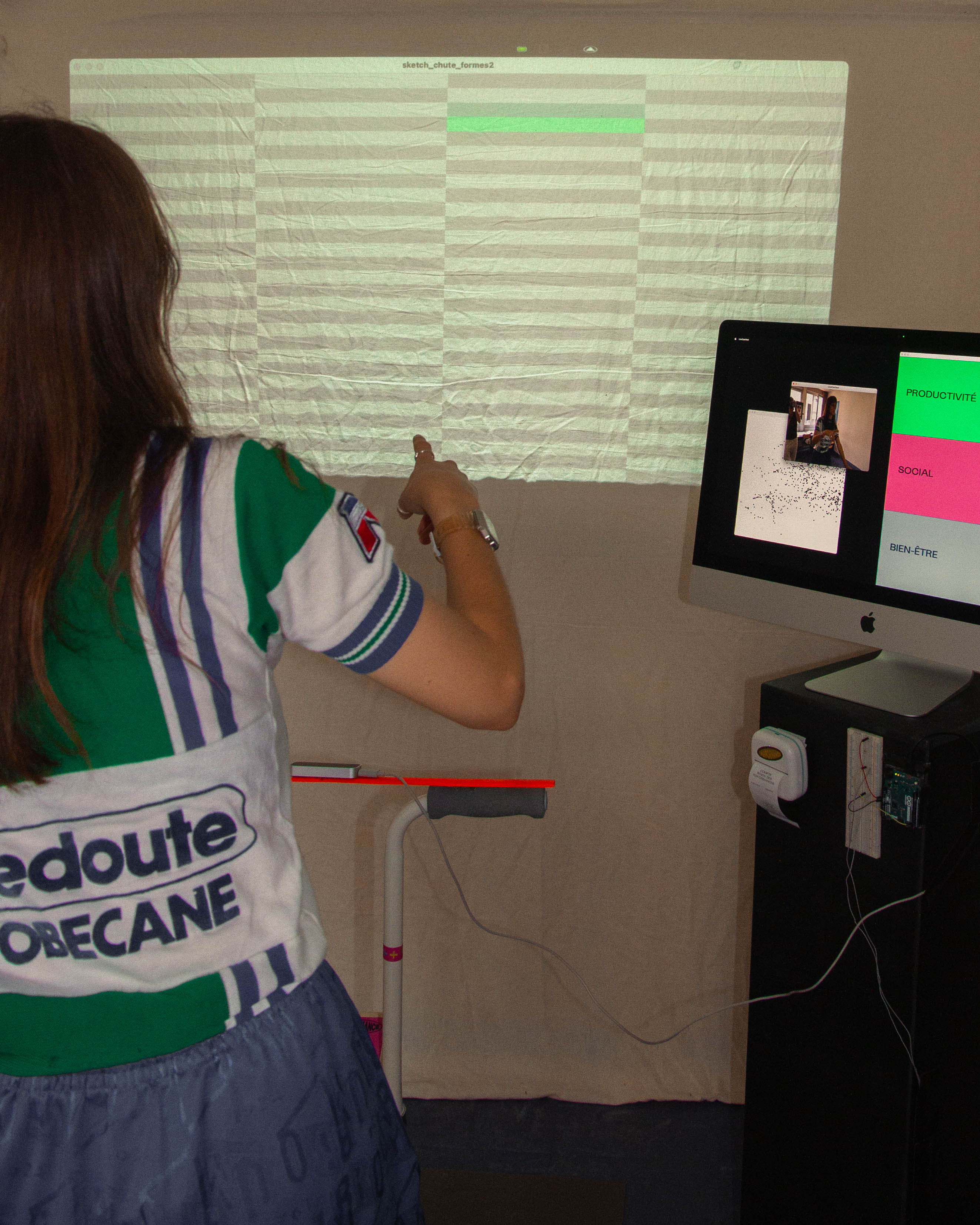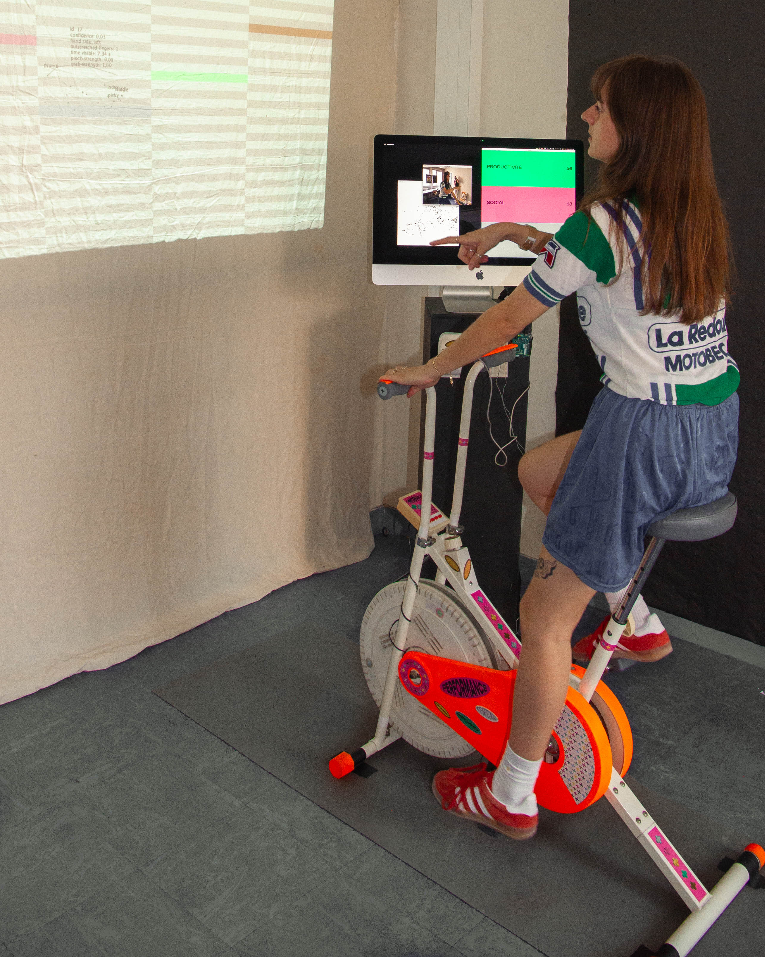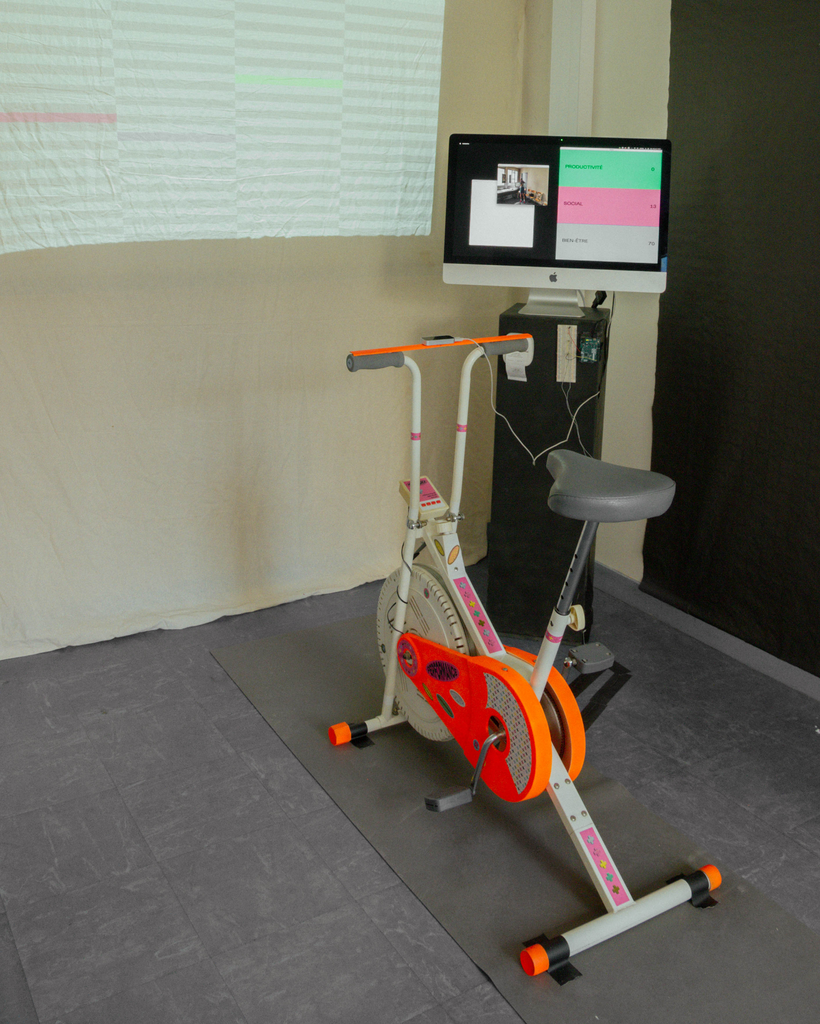 The installation comprises a bicycle connected to a projection and a screen. Three quantifiable performance criteria are taken into account: productivity with the score achieved in the mini-game, well-being with the physical effort made on the bike, and being happy at work with the smile captured on the webcam. The idea was to have this injunction to performance, speed and productivity, while at the same time having to be happy at work, demonstrating the impossibility of maintaining a balance between these three elements.