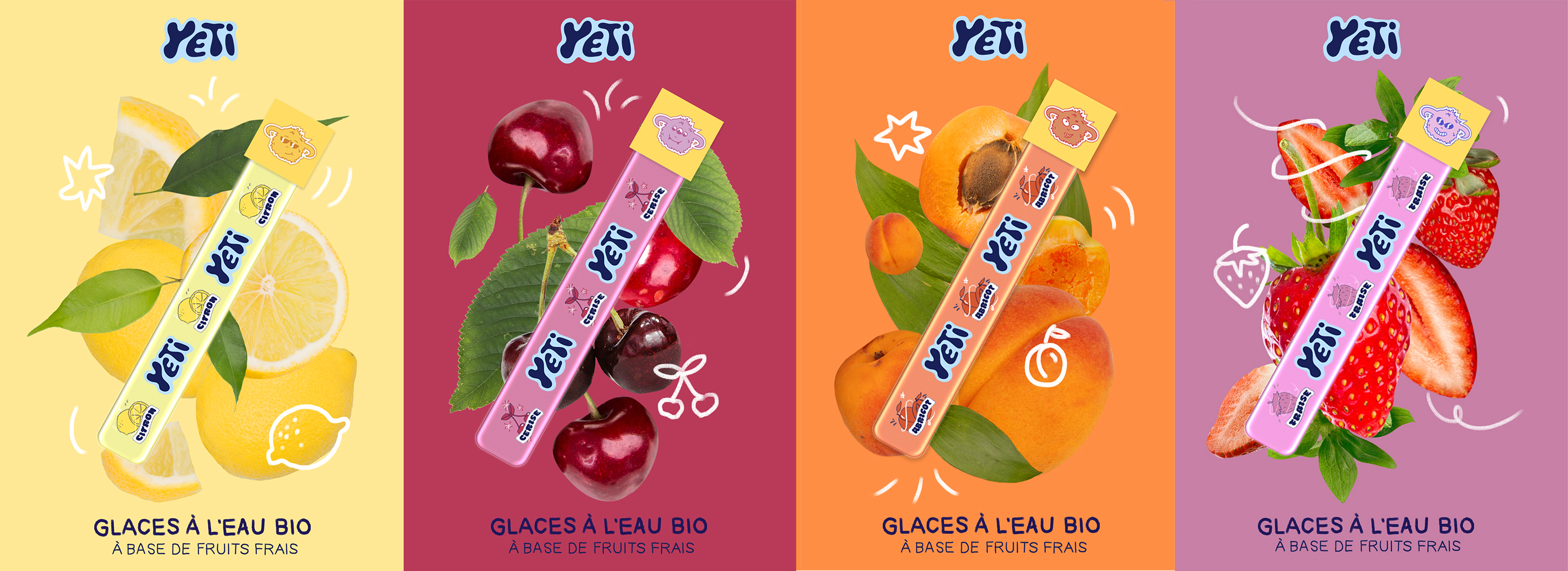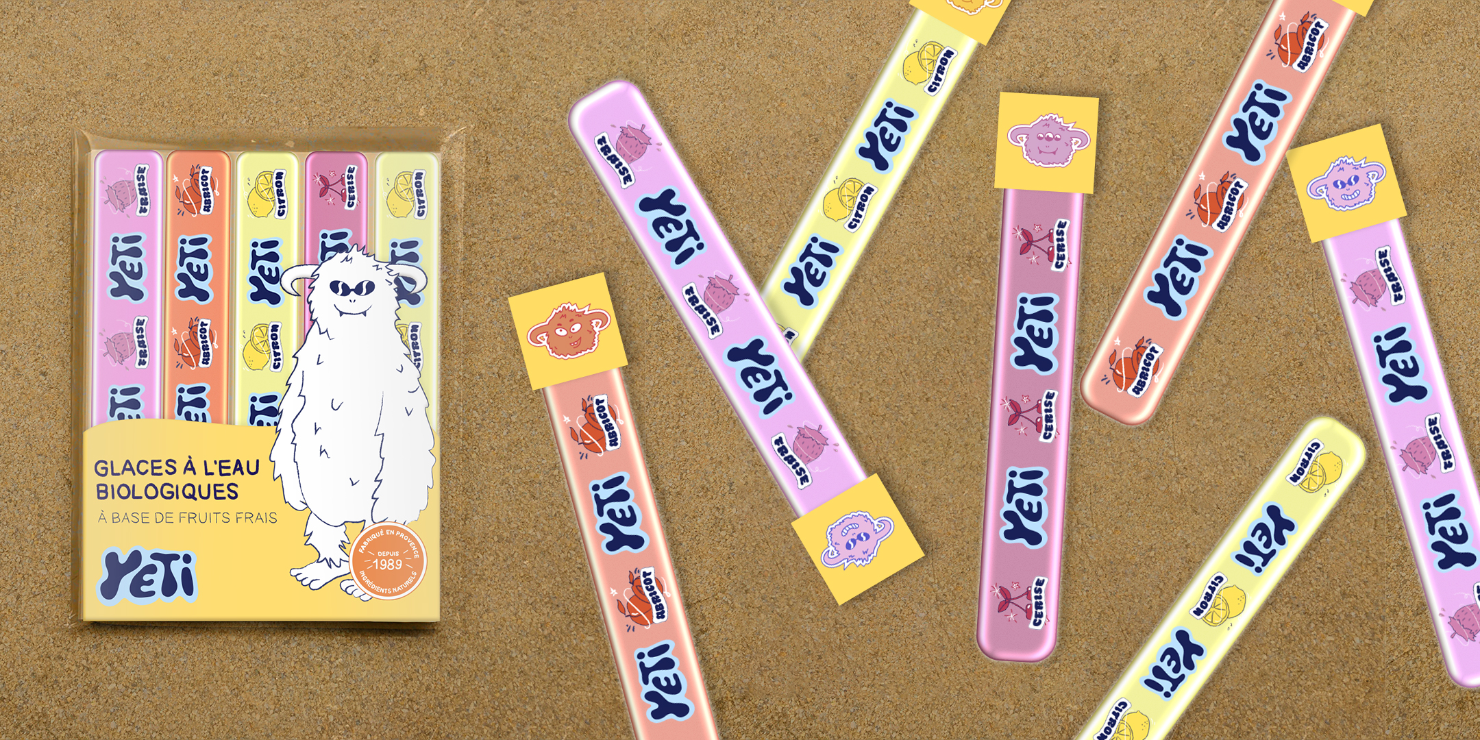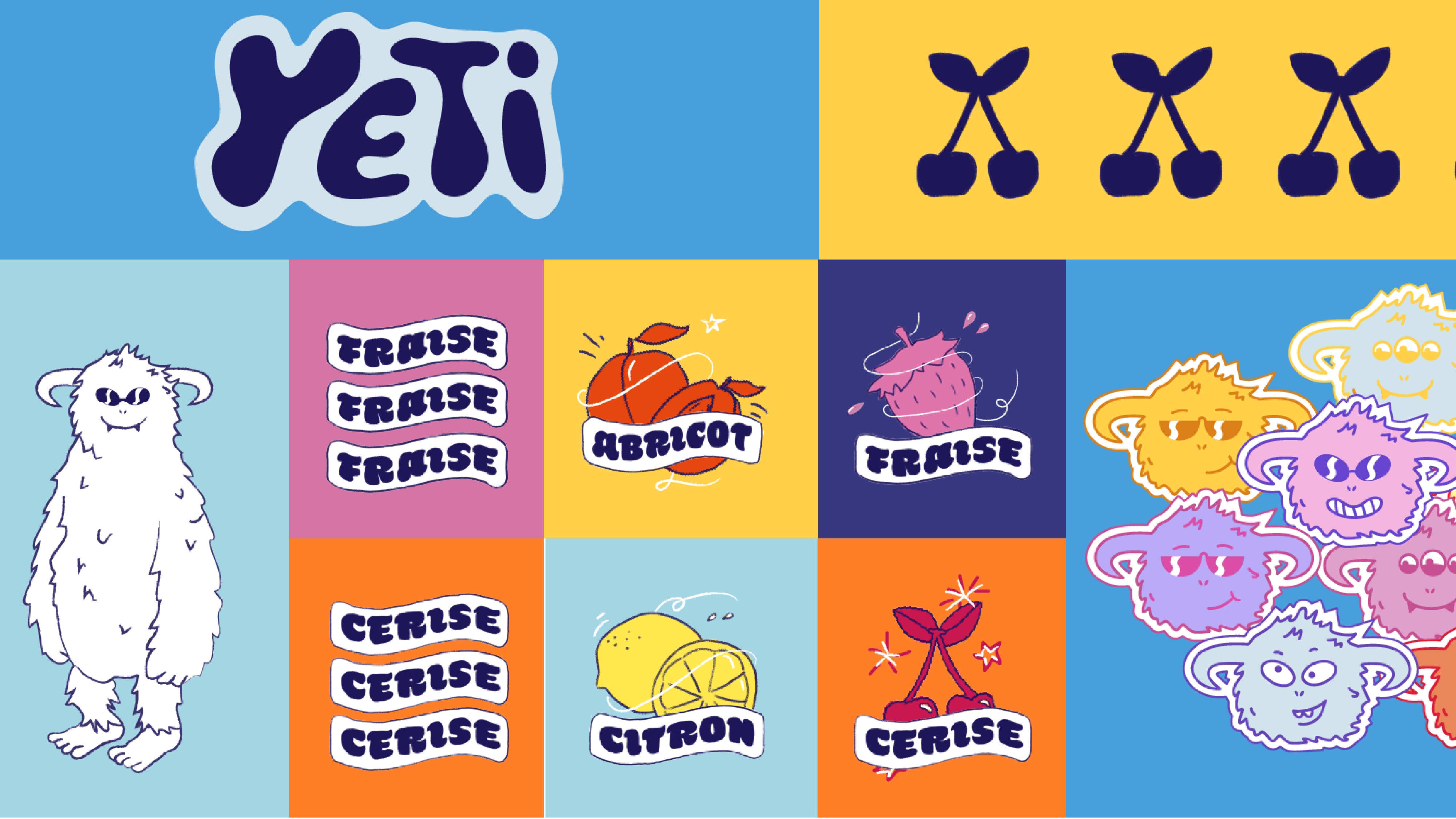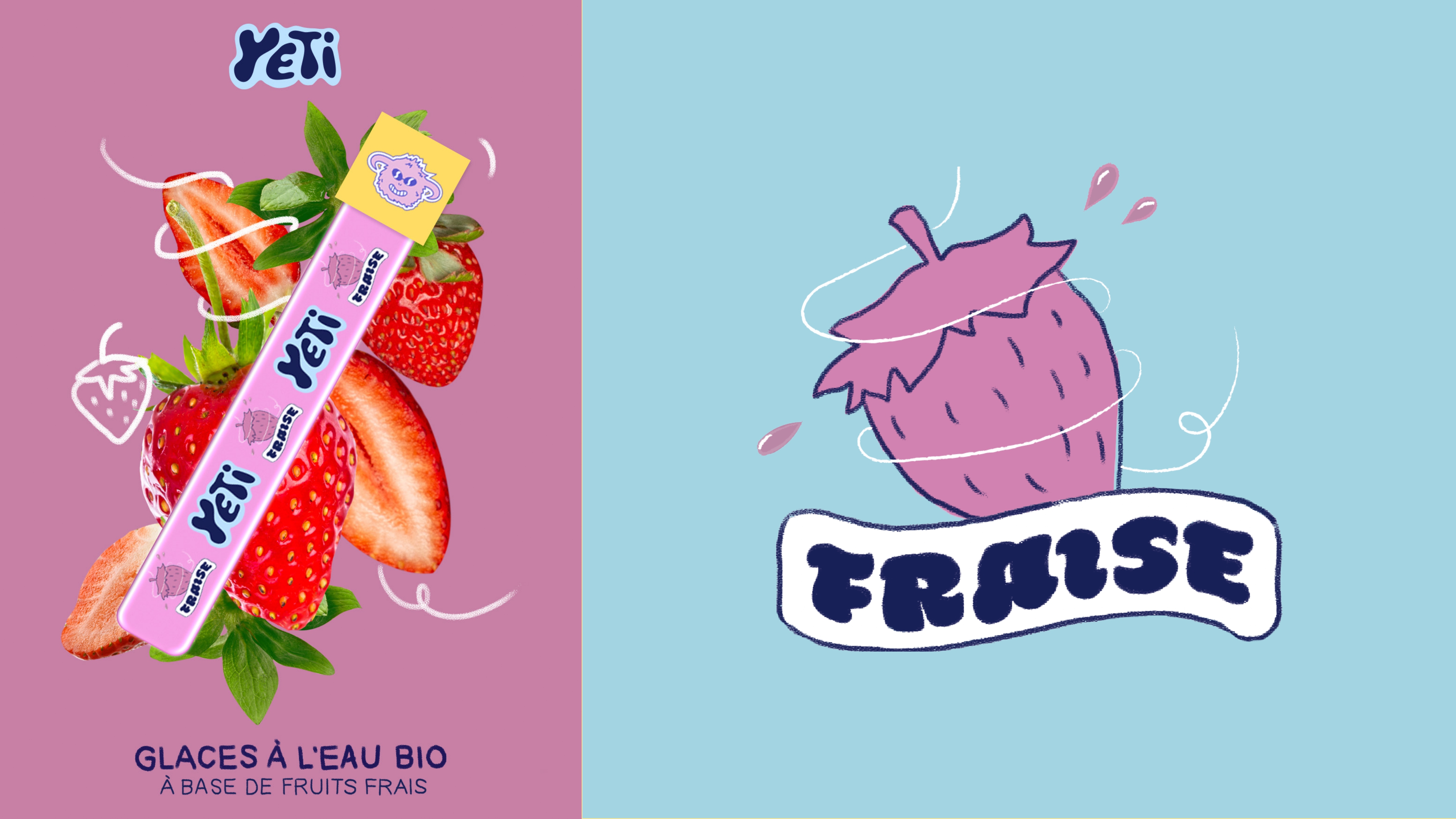For this, I chose the French popsicle brand Yetigel. I first started by doing a marketing study to analyze the brand's context as well as possible, taking into account its pillars and values in order to make it evolve and create an identity corresponding to the brand.